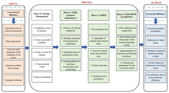 The proposed general model, detailed in the following sections, aims to improve operational efficiency in plastic packaging production through a structured three-phase approach integrating TPM, SMED, and Machine Learning. This framework targets key inefficiencies, including prolonged downtime, extended setup times, and elevated defect rates such as flash and defective products, by enhancing equipment reliability, optimizing setup processes, and employing data-driven predictive maintenance. The initial phase establishes a foundation via planned maintenance and process standardization, followed by a second phase that reduces setup durations through task reallocation and optimization [25]. The final phase leverages Machine Learning for real-time data analysis and parameter adjustments. Implemented within a Peruvian SME in the plastic sector, this model seeks to boost machine availability, streamline production, and reduce costs associated with inefficiencies, presenting an innovative solution for under-explored industrial settings [26,27]. The model’s structure and implementation are illustrated in Figure 2.