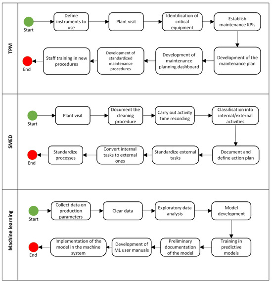 The key contribution of this paper is the integration of TPM, SMED, and machine learning to improve operational efficiency in plastic packaging production, which distinguishes it from earlier approaches that applied these tools independently. TPM was specifically implemented through the third pillar, planned maintenance, with the aim of improving the mechanical availability of injection molding and blow molding machines. The machines with the greatest impact on operational efficiency were found to prioritize their maintenance. Preventive maintenance tasks (cleaning, inspection of critical parts, calibration of sensors, etc.) were set up with specific frequencies. Standardized maintenance manuals were developed, along with a maintenance planning and control dashboard. On the other hand, SMED (Single Minute Exchange of Die) was applied with the aim of significantly reducing machine setup times, especially during mold changes, configurations, and cleaning, on injection and blow molding machines. A study of current mold change and machine setup procedures was conducted, and tasks were classified as internal and external. Tasks that were previously performed with the machine stopped (such as tool preparation or mold verification) were moved to be performed while the equipment was still running, minimizing downtime. Critical activities were simplified, redundant steps were eliminated, and standardized procedures were set up for setup, cleaning, and adjustment.