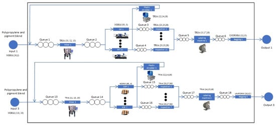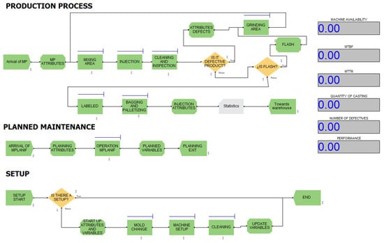 The operational dynamics of the selected plant are modeled in Figure 8, which presents the Arena model of the improved production system. This model visualizes the production flow, integrating the time distributions specified in Table 18, including operating times, material arrivals, planned maintenance arrivals, and maintenance operations. These parameters enable a complete simulation to evaluate process efficiency and validate the proposed improvements.