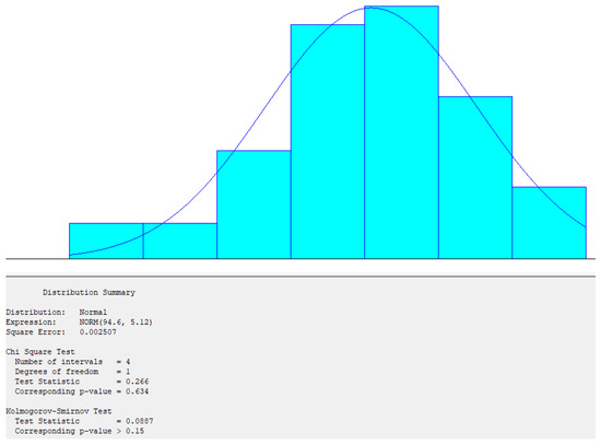 The current production system, illustrated in Figure 6, outlines the operational flow of the plastic packaging plant. To accurately simulate this process in the Arena software 16.20.09, time samples were collected from each area of the system to represent the behavior of different entities. Prior to their implementation in the model, these data were statistically validated using Arena’s Input Analyzer tool, employing both the Chi-square and Kolmogorov-Smirnov goodness-of-fit tests. This procedure ensured the selection of the most appropriate probability distribution for each entity. An example of the fitted distribution is presented in Figure 7, while the complete set of distribution expressions used in the simulation model is summarized in Table 18. The same methodology was consistently applied across all remaining entities in the system.