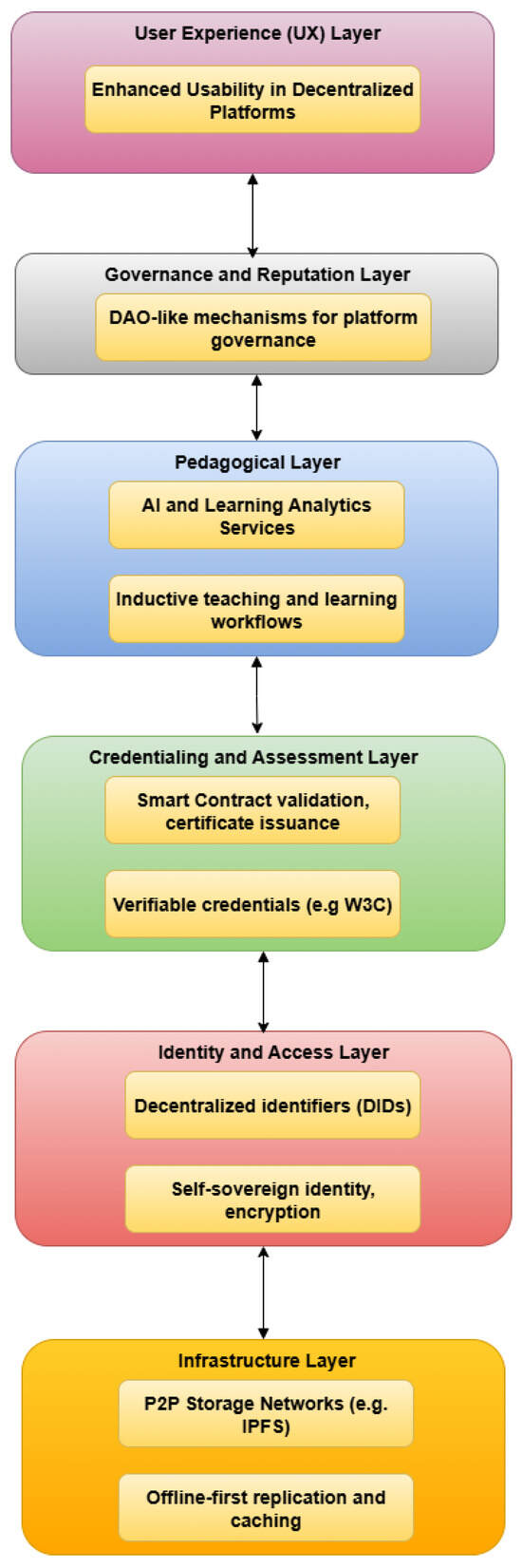 - P2P Storage (IPFS, Swarm): Facilitates the distribution of learning content without relying on single-point failures or proprietary content providers [8].