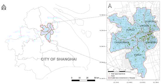 As the scope of this empirical study is to capture variations in RSR over a long historical trajectory, our research focuses on the following six central districts in Shanghai: Huangpu, Xuhui, Changning, Jing’an, Putuo, and Hongkou. These areas are known as Shanghai’s Concession, which was established by foreign powers such as Britain and France in the 1880s, during which time the concept of the department store was introduced to Shanghai, making it one of the earliest urban retail hubs in China. These districts have since witnessed multiple historical transformations, from the concession era to the founding of the People’s Republic and the era of economic reform. During these transitions, the retail areas in the city’s core, including Nanjing Road, Huaihai Road, and Chenghuangmiao, continued to operate and still do to this day, demonstrating strong resilience [26]. This long-standing and dynamic retail history makes Shanghai’s central districts a highly valuable context for studying urban retail space resilience.
