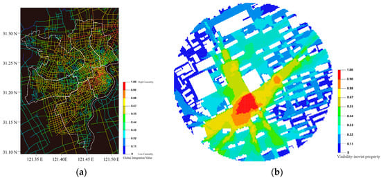 In this study, the DepthMapX platform is used to compute Global Integration values for the study area, and the results are shown in Figure 2a.