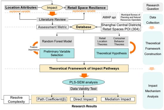 Therefore, this study aims to disclose the complex impact mechanism of location attributes (LAs) on retail space resilience (RSR) based on an empirical study in Shanghai. Our research proposes an integrated methodology that combines Random Forest for preliminary variable selection with partial least squares–structural equation modeling (PLS-SEM) for causal pathway testing. First, we develop an assessment metric system for both RSR (as the explained variable) and LAs (as explanatory variables). Random Forest identifies key LA variables with strong predictive power, which are then embedded into a theoretical framework constructed from a literature review. PLS-SEM is subsequently applied to test the hypothesized pathways. By pairing machine learning with SEM, this approach leverages both statistical rigor and predictive accuracy to uncover robust, interpretable mechanisms, offering deeper insights into how spatial attributes and consumer behavior jointly shape retail resilience.