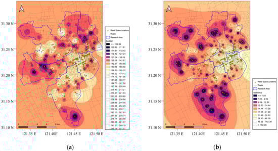 IDW interpolation of retail space footfall and resilience: (a) customer footfall; (b) resilience (footfall weighted with lifespan).