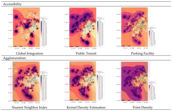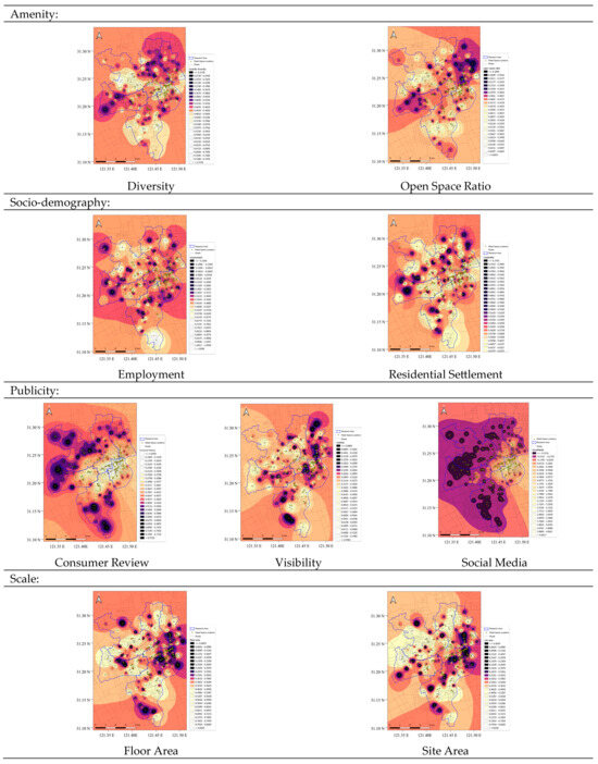 The explanatory variables consist of six location attributes (LAs), each measured with two indices, totaling 15 variables. Raw geo-spatial data were processed based on the corresponding assessment metric and then visualized using IDW interpolation at a 2 m distance (Figure 5).