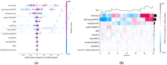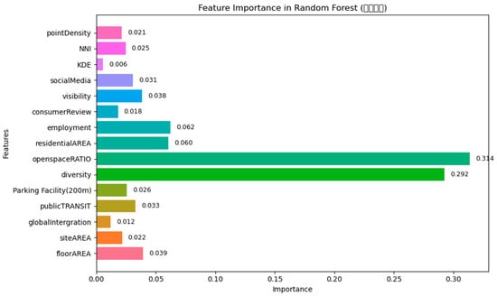 Then, the RF model was trained and predictions were made on the test set, and the feature importance output is illustrated in Figure 6. This prediction result achieved reasonable reliability with a Train R2: 0.897, Test R2: 0.572, RMSE: 21.584, and MAE: 16.726. As shown in the feature importance map, both diversity and open space ratio within the Amenity attribute of retail locations show substantial feature importance. Kernel density estimation and global integration shows low feature value, meaning that these two variables does not have much influence in the overall combined impact toward RSR. Then the rest of the LA variables shows moderate impact in the test set.