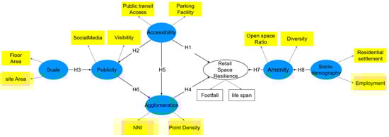 Building on the concept of retail resilience, scholars have explored its intangible drivers from various angles. Some studies have focused on policy, highlighting how flexible and inclusive retail management can strengthen resilience [1,12,13]. Others, informed by consumer culture theory, stressed the need for retail spaces to adapt to evolving consumer expectations and satisfaction-driven strategies [14]. On the other hand, a group of scholars has examined the impact of geo-spatial attributes of retail spaces on retail resilience. Kärrholm (2014) argues that retail activity is inherently tied to its spatial form, with the physical configuration and urban context playing a critical role in resilience [15]. In his research, he cited the concept of spatial resilience, which refers to the ability of a space to maintain its functions and withstand disturbances, which depends on the interdependence between the space and its surrounding environment [16]. Recent empirical studies have shown that spatial location attributes, including Accessibility [17,18], Amenity [19], Agglomeration [20], and Socio-Demographic features [21], demonstrate a strong correlation to resilience in urban retail spaces.