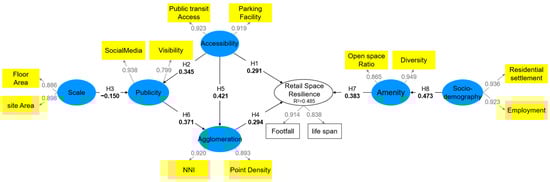 Finally, partial least squares SEM (PLS-SEM) is used to test the hypothesized pathways. PLS is particularly suitable for complex models with formative indicators, smaller samples, and non-normal distributions [73]. The path coefficients (β) generated by the model provide empirical evidence of both the magnitude and direction of impact each LA variable has on RSR. In addition to direct pathways, the model also reveals mediating effects, allowing the identification of both primary and secondary influence chains. This integrated approach provides a robust, interpretable structure for understanding how location attributes jointly shape resilience in urban retail spaces.