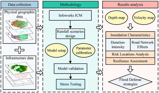 The incorporation of resilience concepts into flood risk management has proven to be effective in enhancing community disaster preparedness [22]. Aerts et al. [23] simulated 549 storm surges using a coupled hurricane–hydrodynamics–flood model and further calculated census block-level damage to buildings and vehicles using flood depth–damage curves. Melendez and Gutierrez Soto [24] presented the PEOPLES framework for quantifying a community’s overall resilience to flooding in seven dimensions using Harlan County, Kentucky, as an example. Several studies have utilized population-based survey data to develop a framework for assessing community resilience, including additional social factors based on community participation and psychological support [25,26,27]. Abdel-Mooty, El-Dakhakhni, and Coulibaly [15] developed a two-step framework based on spatial analysis and machine learning to accurately categorize and predict the resilience of communities to flooding and their response to future flood hazards. Yuan et al. [28] employed social media and machine learning techniques to assess the impact of flooding on communities and to sense the social impact of emotional signals. However, there remains a significant gap in research that combines high-precision hydrodynamic simulation results with resilience assessment methods. This gap limits the accurate assessment and effective management of flash flood hazard risk.