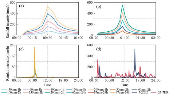 Rainfall scenarios: (a) 1 h rainfall scenarios; (b) 2 h rainfall scenarios; (c) 24 h rainfall scenarios; (d) 23·7 HR and 20·7 ZZ scenarios.