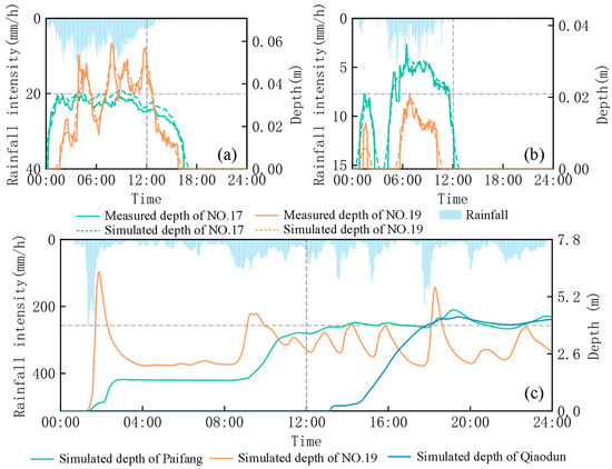 The results revealed a non-linear relationship between rainfall intensity and inundation depth. At a rainfall intensity of 60 mm/h, the average inundation depth in the built-up area was 0.27 m, which remained below the building flood warning level (0.4 m). However, some low-lying areas showed higher vulnerability. At a rainfall intensity of 100 mm/h, the road system exceeded the warning level (>0.6 m), with water levels reaching 3 m in the bridge area, creating a regional high-risk zone. Inundation depths in the densely built-up area remained between 0.27 and 0.6 m, demonstrating the area’s flood resistance capacity.