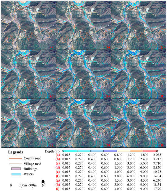 Inundation depth maps: (a) 30 mm, 1 h; (b) 60 mm, 1 h; (c) 100 mm, 1 h; (d) 100 mm, 2 h; (e) 150 mm, 2 h; (f) 200 mm, 2 h; (g) 97 mm, 100 y, 24 h; (h) 23·7 HR; (i) 7·20 ZZ.