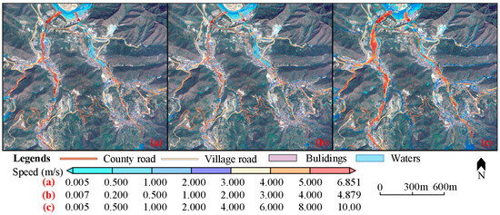 A community located on a particular hillside was chosen as the study area. The settlements are distributed along the ravine and proximate to the river, exhibiting a topographical gradient that descends from south to north. Intense precipitation events generate multiple confluences with high flow velocities. These hydrological pathways intersect the main built-up areas of the community, thereby creating significant flood risk. The distribution of flood inundation depths for the rainfall scenarios is shown in Figure 7, and the distribution of flood flow velocities for the three typical rainfall scenarios is shown in Figure 8.