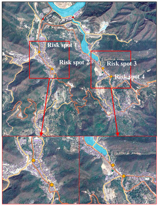 Based on the simulation results, the risk points are primarily concentrated in topographic confluence areas, bridge culvert areas, and low-lying areas prone to waterlogging. The risk spots are shown in the figure below (Figure 9).