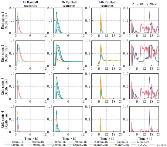 The four identified risk locations exhibit distinct waterlogging characteristics and temporal patterns. Risk point 1 reaches waterlogging depths of 1.8–2.0 m during short rainfall events. Its inundation periods last 4–6 h. Risk point 2 experiences the most severe waterlogging. Its maximum depth ranges from 1.2 to 1.5 m. During the 7·20 ZZ rainfall event, waterlogging persists for 12 h. Risk point 3 experiences moderate waterlogging of 0.8 m depth because its drainage is efficient. Water typically subsides within 3–4 h. Risk point 4 responds rapidly to rainfall. Its waterlogging depth reaches 1.0–1.5 m but subsides within 2–3 h. Rainfall duration affects waterlogging depth. Short rainfall events cause deeper waterlogging. Long rainfall events lead to repeated flooding. The changes in depth at each risk point under different rainfall scenarios are shown in Figure 10. Table 5 gives the duration and maximum depth of water accumulation at each risk point under different rainfall scenarios.