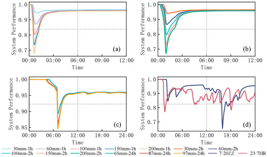 The system performance: (a) 1 h rainfall scenarios; (b) 2 h rainfall scenarios; (c) 24 h rainfall scenarios; (d) 23·7 HR and 20·7 ZZ scenarios.