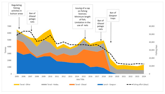 Total landings based on main fishing methods and corresponding major fisheries regulations in Abu Dhabi waters. Adapted from EAD, 2024 [19].