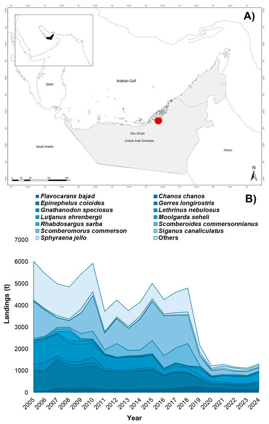 (A) Map of the study area and (B) official landings (t) of 13 key pelagic and demersal fish species in the Abu Dhabi waters in the 2005–2024 period. The red circle indicates the landing site where biological samples were collected. Adapted from EAD, 2024 [19].