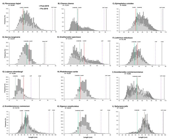 Length–frequency distributions of commercial catches of 12 key species in the pre- and post-2019 periods, and their reference points, including Lcatch (solid green vertical line), Linfinity (dashed purple vertical line), and Lmax (dashed black vertical line), estimated in 2024. Maturity size (Lmaturity, red dashed vertical lines) is from a literature search. (M. seheli was excluded due to the absence of historical length data, while C. chanos was represented only in the post-2019 period).