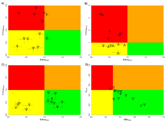 Kobe plots with CMSY++ and LCCC outputs for status indicators for 13 stocks in different years in the time series, including the pre-2019 period (initial year 2005 (A)), the year some regulations were introduced (2015 (B)), and the post-2019 period (final year 2024 (C,D)). Arrows represent confidence intervals for B/BMSY and F/FMSY for the respective years. FAO species codes are given in Table 1.