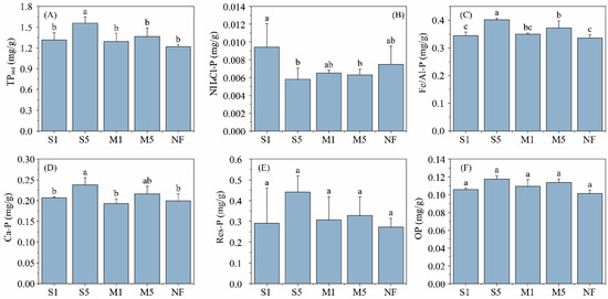 For the sediment P fractions (Figure 5), TPsed, Fe/Al-P, and Ca-P contents were significantly higher in S5 (p < 0.05), followed by M5 (p < 0.05), while Res-P and OP showed no significant differences among treatments (p > 0.05). Inorganic P remained the dominant P fraction in the sediments across all treatments.