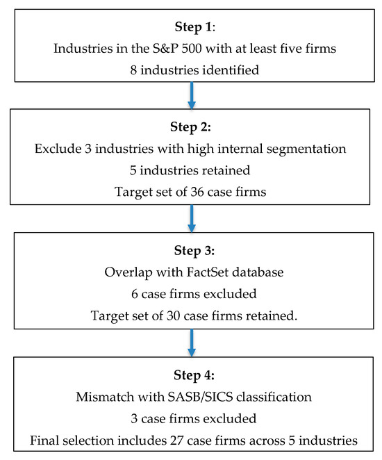 As mentioned above, FactSet maps the data on media coverage to the 26 ESG issues defined in the SASB’s framework, thereby enabling assessments of media attention that are aligned with industry-specific ESG financial materiality. However, SASB’s Standard Industry Classification System (SICS) [26] groups firms into industries based on the similarities of sustainability issues, which sometimes differ from the GICS classification used by the S&P500 index, initially used in our selection of industries. Therefore, the selected cases were matched with the SASB’s SICS to allow the identification of the ESG issues that are financially material in their respective industry. An important mismatch between GICS and SICS was identified for three firms in our sample. Precisely, JP Morgan Chase & Co. belongs to the GICS industry Diversified Banks, while SASB assigns the firm to Investment Banking and Brokerage. JP Morgan Chase & Co. would be the only firm in this SICS category. Similarly, two other firms classified by SASB under the Meat, Poultry and Dairy industry were excluded because this industry (or GICS) was not part of our initial selection. After excluding these three cases, the final selection comprises 27 firms across five different SASB SICS (see Appendix A for a complete list). Figure 1 summarizes our strategy to select the case firms for the study.