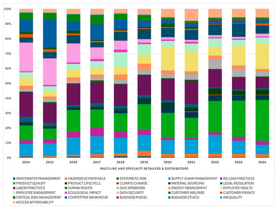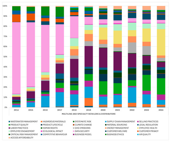 ESG media attention at the industry level: financially material ESG Issues—Multiline and Specialty Retailers and Distributors (2014–2024).