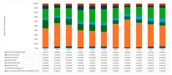 To explore the data on news media attention (i.e., Volume score), the analysis relies primarily on data visualization tools suited for longitudinal analysis. While the available FactSet dataset covers a period from 2007 to 2024, the analysis covers an 11-year period, from 2014 to 2024. Our analysis begins in 2014 to align with advancements in data mining technology introduced by FactSet Truvalue Labs [25], along with corresponding improvements in its methodology and coverage, which enhance the accuracy and reliability of the Volume score. It is worth noting that Volume scores are based on daily entries of the number of news articles addressing a particular ESG issue for the focal firm. This count is then expressed as a percentage of all news articles mentioning the firm during the same period (e.g., day, month, or year). As such, the Volume score captures, on a daily basis, the relative share of media attention devoted to each ESG issue, within the full set of 26 SASB-informed topics, for the focal firm. The result is a large dataset comprising approximately a total of 2.8 million daily data entries for the selected 27 firms over the 11-year timeframe and across the 26 ESG issues. We therefore calculated the yearly mean of the Volume score, which is the sum of daily percentages divided by the number of days with entries in that year, across a span of 11 years (2014–2024) for each of the 27 firms and for each of the 26 ESG issues. Given the variation in the daily scores throughout a year, the yearly mean (instead of focusing on the score on a single day) better reflects the average media attention each ESG issue receives over an entire calendar year (e.g., 1 January or 31 December). The result is a dataset with around 10,000 observations. Appendix B illustrates an example of the annual mean Volume Scores for the company Johnson & Johnson, one of the firms included in our analysis. This yearly average calculation was applied consistently across all firms and years to provide a comprehensive multi-year, multi-industry overview.