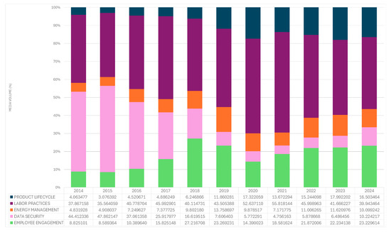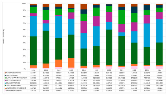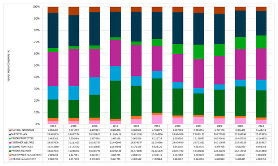 In the case of Multiline and Specialty Retailers (Figure 4), media attention appears broadly distributed across the 26 SASB-informed ESG issues, with no single topic receiving disproportionately high levels of coverage. The most notable variations observed in this industry are a 90% decline in media attention to Data Security (pink) and a 182% rise in Product Quality (light green) over the period under analysis (Figure 4). Stakeholder concerns about Employee Health (yellow) also rose by 75% between 2014 and 2024, while issues related to Supply Chain Management (blue) displayed relatively important salience but minimal variation over the period.