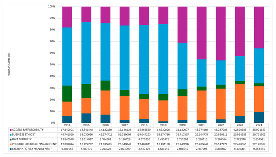 This first approach aims to provide insights into how news media attention across the full set of 26 SASB-informed ESG issues evolved within each industry. To assure comparability we used the SASB industry classification to group the case firms into six distinct industries and calculated an industry-level aggregated volume score over the period under analysis (2014–2024). Thus, the resulting interactive stacked bar charts show the annual percentage of media coverage devoted to each ESG issue. Each colored segment represents a specific ESG issue, providing a clear visualization of shifts in media attention over time. These charts offer a high-level view of cross-issue variation and reveal preliminary insights into the evolving nature of stakeholder expectations.