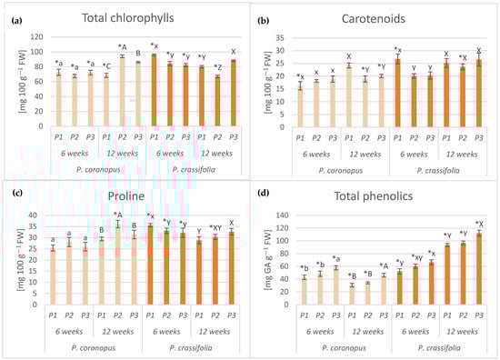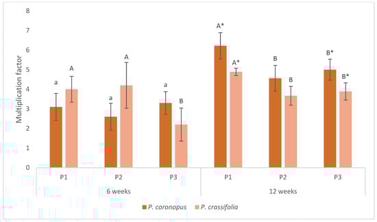 | P. crassifolia | 6 | P1 | 12.50 ± 1.70 b | 11.43 ± 1.20 a* | 15.46 ± 2.06 b | 24.40 ± 3.29 a* | 95.26 ± 1.52 a |