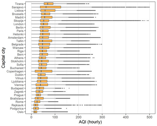 Distribution of hourly Air Quality Index (AQI) values for selected European capitals, based on data from 2010 to 2024. (IQR—orange, median—black vertical line, outliers—black dots).