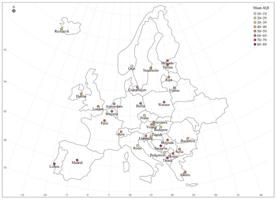 Spatial distribution of mean annual Air Quality Index (AQI) in 33 European capitals (2010−2024).