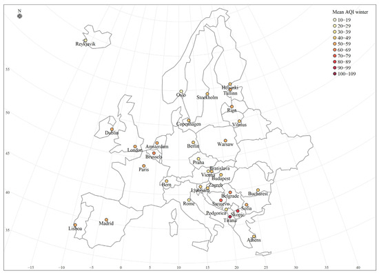 Spatial distribution of mean winter Air Quality Index (AQI) in 33 European capitals (2010−2024).