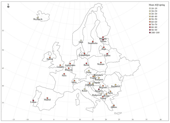 Spatial distribution of mean spring Air Quality Index (AQI) in 33 European capitals (2010−2024).