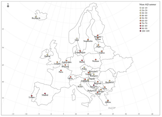 Spatial distribution of summer mean Air Quality Index (AQI) in 33 European capitals (2010−2024).