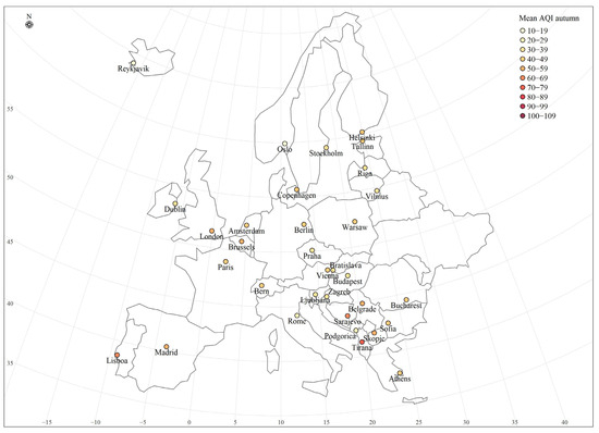 Spatial distribution of mean autumn Air Quality Index (AQI) in 33 European capitals (2010−2024).