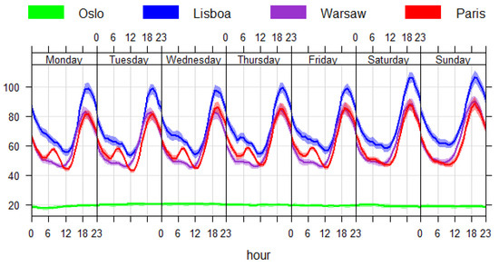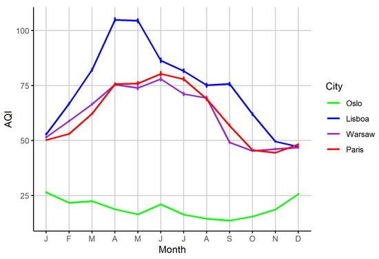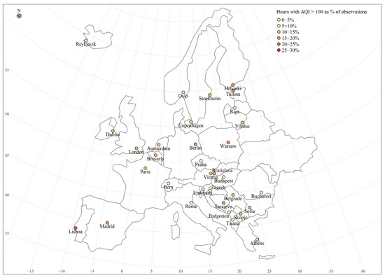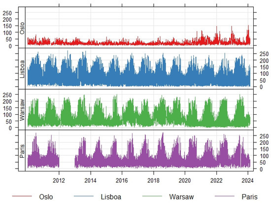 Meanwhile, in high-income countries such as Australia, air pollution remains a significant but more preventable risk, with modeling studies indicating that substantial health and economic benefits can be achieved through targeted reductions in PM2.5 and ozone exposure [29]. Cost–benefit analyses also underscore the disproportionate public health returns of air quality interventions in urban areas, particularly when targeting transport and energy sectors [30]. Despite the availability of hourly pollution data across European monitoring networks, no studies have analyzed long-term temporal dynamics in the AQI across multiple capitals, nor have they combined AQI pollution data with population-scale exposure metrics. This study aims to fill that gap by analyzing over a decade of hourly AQI data (2010–2024) for 33 European capitals. The analysis explores both general trends and city-level case studies, with a focus on pollution intensity, exceedance patterns, seasonal cycles, and population-normalized exposure burdens. Four cities—Paris, Oslo, Lisboa, and Warsaw—were selected for in-depth comparison, representing different regions, population sizes, and air pollution regimes. By identifying spatial and temporal patterns in air quality and underscoring periods of high health risk, this work seeks to contribute to evidence-based strategies for urban air pollution mitigation and public health planning.
