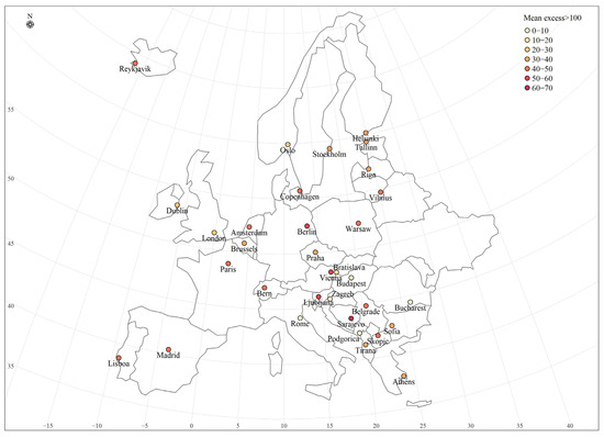 Spring mean AQI across Europe’s capitals (Figure 4) varies nearly fivefold, from an exceptionally low 19.26 in Oslo and 19.37 in Podgorica to an extreme 100.52 in Sarajevo. Two other outliers—Reykjavik (21.26) and Rome (23.26)—also record some of the cleanest spring air, followed by Zagreb (31.62). At the opposite extreme, Sarajevo’s spring pollution soars above 100, with Lisboa (97.28) and Tallinn (91.88) not far behind; Berlin (83.35) and Vilnius (83.21) also exceed an AQI of 80. Whereas annual and winter means display a simple north–south gradient, spring AQI highlights intense pollution episodes in three distinct “hotspots”: the Balkan basin, the western Mediterranean (driven in part by Saharan dust and in part by increased ozone levels [14,15]), and the Baltic–northern plain. Central European capitals generally fall into a midrange AQI bracket (40–60), reflecting more moderate springtime air quality.