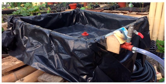 To hold the water used in the crop, three wooden boxes were assembled with dimensions of 90 cm long, 90 cm wide, and 25 cm high. In these boxes, black plastic is placed on the internal part to retain water for the crop, as shown in Figure 1. Water is poured up to a level of 10 cm, which gives a volume of 81 L, which is calculated with Formula (1), to this amount of water is placed the nutritive solution indicated by Angel Llerena [3], who recommends pouring 5 mL of solution A for each liter of water and 2 mL of solution B for each liter of water. The values of the nutritive substance to be placed are obtained with Equations (2) and (3).