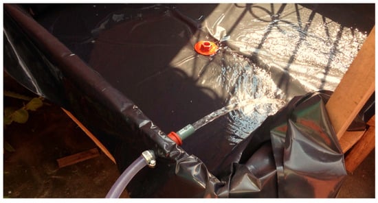 To the 81 L of water in the hydroponic tubs the nutritive solution indicated by Eng. Angel Llerena [3] was placed; he recommends adding 5 mL of solution A to each liter of water and 2 mL of solution B to each liter of water. The values of the nutritive substances to be applied ware obtained with Equations (2) and (3), respectively: