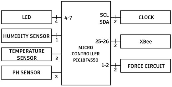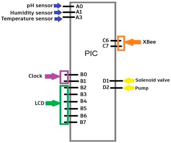 The clock circuit utilized a serial communication protocol (I2C), which employed the SCL and SDA pins, connected to terminals B1 and B0 of the microcontroller. To send the data of the monitored variables, an XBee was used, which was connected to the RX and TX pins of the controller through RS-232 communication. To display the orchard data, a 16 × 2 LCD was used, which was connected to port B (from B2 to B7) of the microcontroller. Figure 4 and Figure 5 show the system connections of each pin of the integrated circuit.