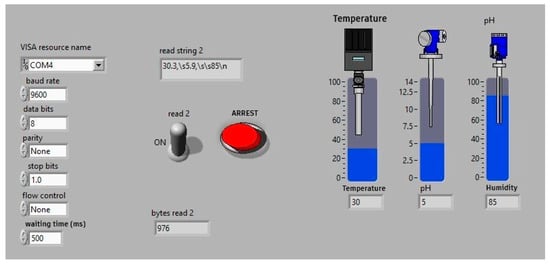 The interface to observe the variables of the crop was developed using the graphical programming environment LabVIEW [48]. The screen consists of three graduated bars reflecting the magnitudes of the three monitored variables temperature, pH and humidity. It has a stop button and a selector for the reading or not of the variables. It also features a space to select the communication port, complete with icons to configure the data reading of the port. Figure 8 shows this communication interface.