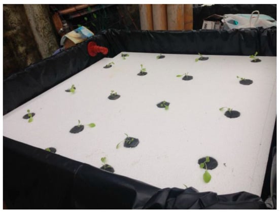 To support the plants in the aqueous solution, the floating root technique was employed, which involved placing them in Plumafon sheets to float above the water level in the hydroponic box. A total of 20 plants were placed in each box during transplanting, as shown in Figure 12.