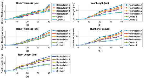 The physiological data obtained in this research show that the number of nutrient recirculations in the hydroponic system significantly influences the growth of romaine lettuce. In the graphs of the variables, it can be observed that for a greater number of recirculations, the development of the stem, leaves, and roots improves Figure 14. This is consistent with previous studies indicating that the oxygenation, movement and constant renewal of solutions promote nutrient availability and prevents the accumulation of toxic residues in the roots [51,52].