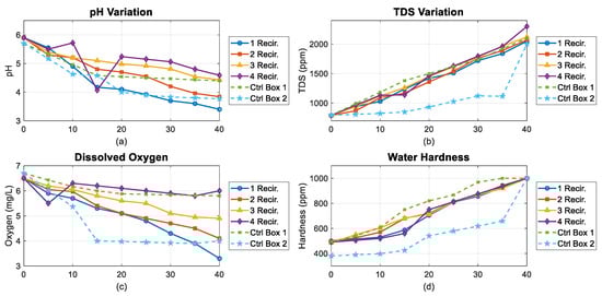 Hardness was higher in the control boxes (up to 1000 ppm), indicating the accumulation of calcium and magnesium without solution replacement. In recirculation systems, the values remained between 600 and 800 ppm, exhibiting greater stability over time (Figure 15d).
