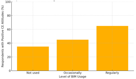 Legend: Data from the BLOOM survey (n = 153). The figure presents the percentage of respondents supporting CE, stratified by their level of BIM usage. Note: Due to non-random sampling, inferential statistical testing (e.g., confidence intervals or error bars) was not applied; values are descriptive only.