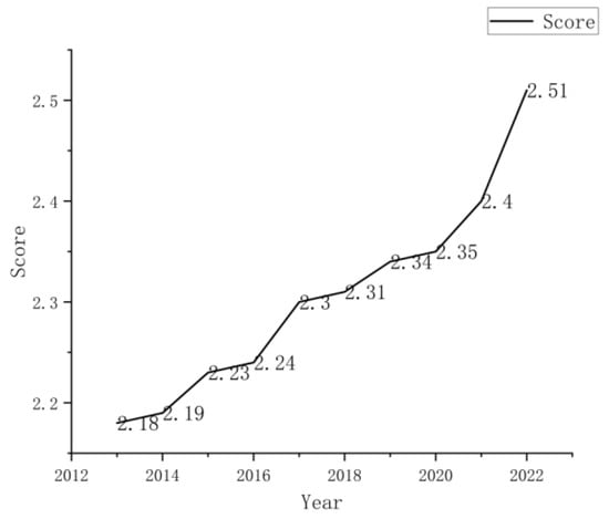 From 2013 to 2022, the score of China’s construction sector development level has exhibited a consistent upward trajectory (Figure 2), reflecting a 15% increase in the composite score over the decade and signifying the industry’s sustained advancement. The reduction in growth rates from 2013 to 2016 may be attributed to the prevalence of a conventional and rudimentary model within the construction industry. Following 2017, the growth rate has experienced an increase, spurred by government policies intended to foster the transformation and modernization of the construction sector, particularly through the introduction of advanced assembly techniques. However, in 2020, the score witnessed a brief decline due to the repercussions of the novel coronavirus epidemic; nevertheless, the industry demonstrated resilience, driven by the “new infrastructure” policy, followed by a swift recovery and a new peak in the subsequent year. In 2022, the score rose to 2.51, indicating that the construction industry made pronounced advancements in the areas of intelligence and sustainability during the 14th Five-Year Plan period. These advancements align with the “dual-carbon” objective and the requirements for sustainable development. China’s construction industry is undergoing a gradual transition, shifting its focus from mere scale expansion to place greater importance on technological innovation and sustainable development. The score curve verifies the shift.