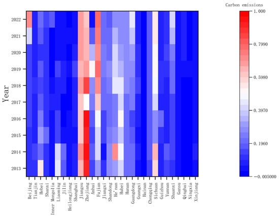 Heatmap of construction industry carbon emissions in China’s 30 provinces (2013–2022).